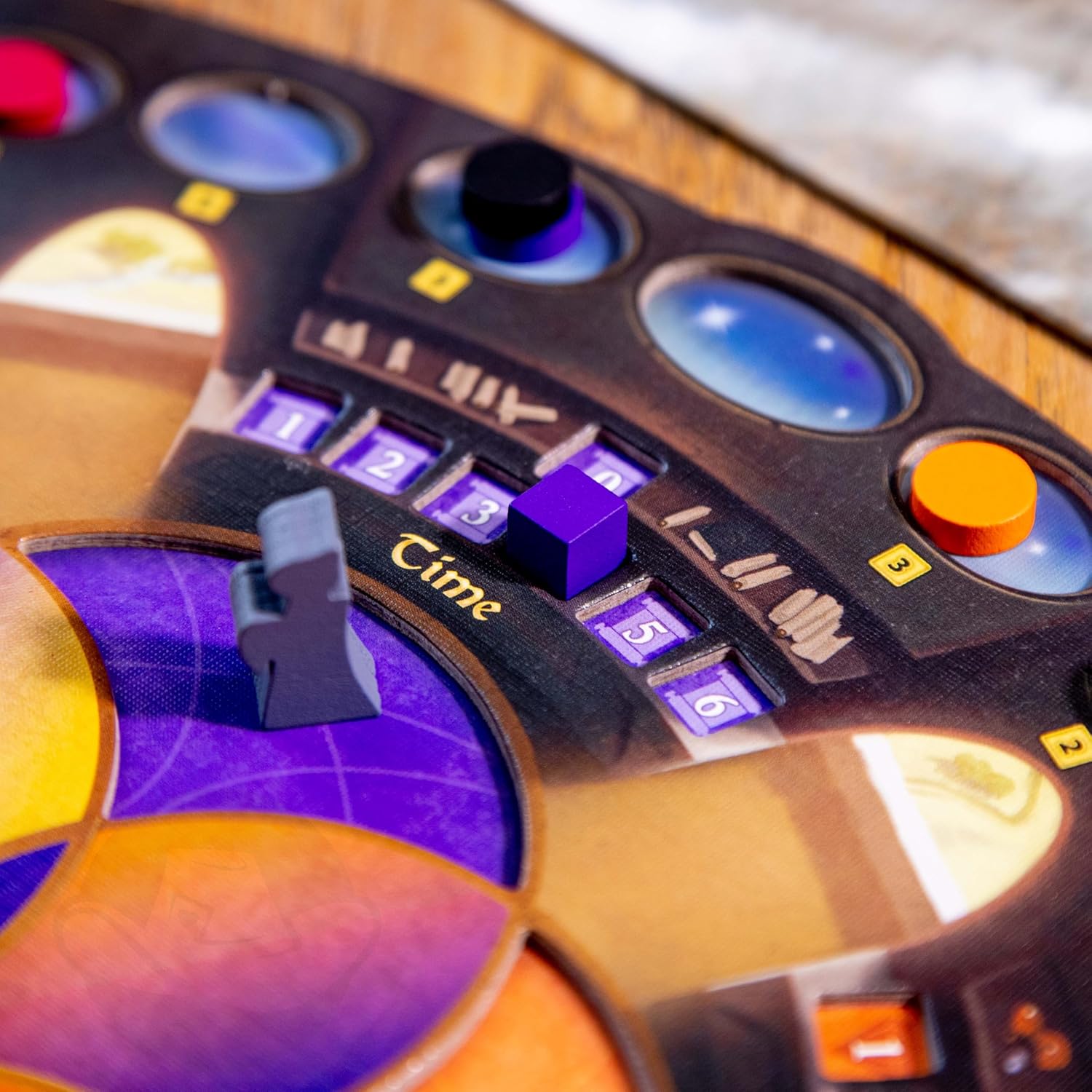 Ending in the Mage's Tower (once it has been built), will let the Mage train and test their Apprentices. On the floor of the tower (player board) is a mandala in which the Apprentices stand. Moving apprentices on the mandala will change the sorts of spells the Order has access to. Testing apprentices sees one apprentice advance to a higher level and allows an Order to discover new spells and magics beyond what any of the Mythic Races could individually know, and to add to those magics to their spell library.