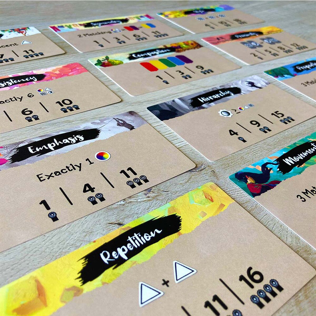 In Canvas, you play as a painter competing in an art competition. Players will collect art cards, layering 3 of them together to create their own unique Painting. Each card contains a piece of artwork as well as a set of icons used during scoring. Icons will be revealed or hidden based on the way players choose to layer the cards making for an exciting puzzle. Paintings are scored based on a set of Scoring cards which will change each game. Once players have created and scored 3 paintings the game ends. On your turn you may take an Art card or make a painting. Art cards are selected from a row of cards in the center of play. Each of these cards has a cost associated with their position. After selecting an Art card you must pay its cost by placing an Inspiration token on each of the cards to its left. If you do not have enough Inspiration tokens, you may not select that card. Any tokens on the card you have selected are kept for future turns. The far left card costs no Inspiration tokens to take. If you have three or more Art cards you may choose to make a painting. Select 3 of your art cards, arrange them in any order and then score them by comparing the visible icons on your painting to the Scoring conditions. Once all players have made 3 paintings the game ends. The player with the most points wins!