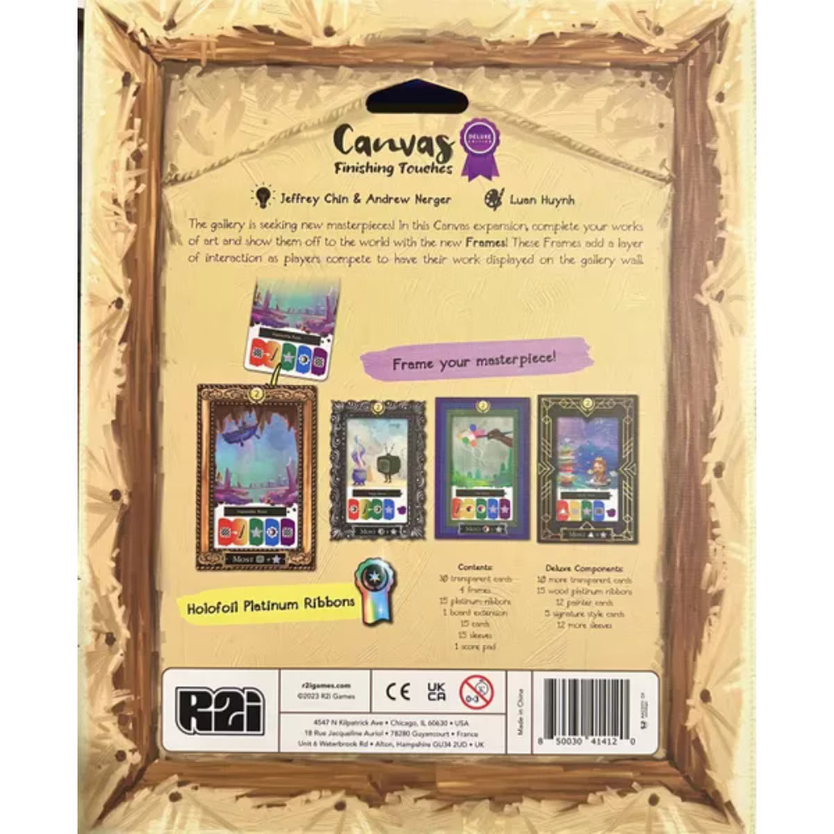 The gallery is seeking new masterpieces! In Canvas: Finishing Touches, complete your works of art and show them off to the world with the new Frames! These Frames add a layer of interaction as players compete to have their work displayed on the gallery wall. The Deluxe Edition includes: + 10 more transparent art cards + 12 painter cards + 15 holofoil wood platinum ribbons + 5 signature style cards + 12 more sleeves