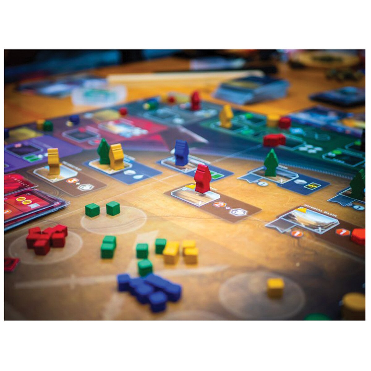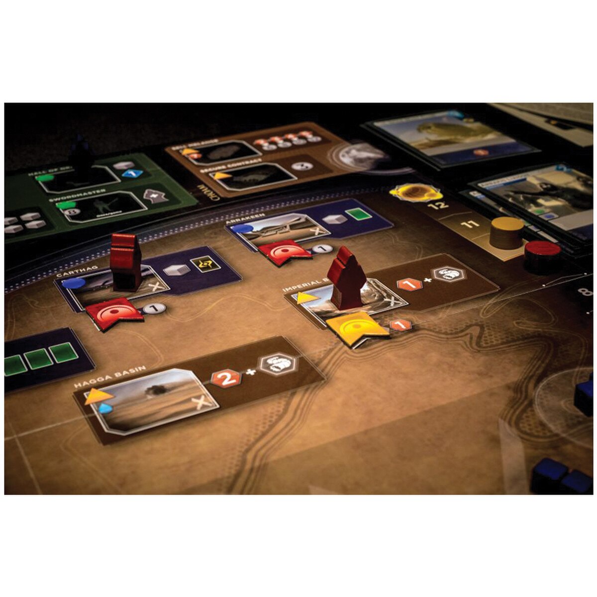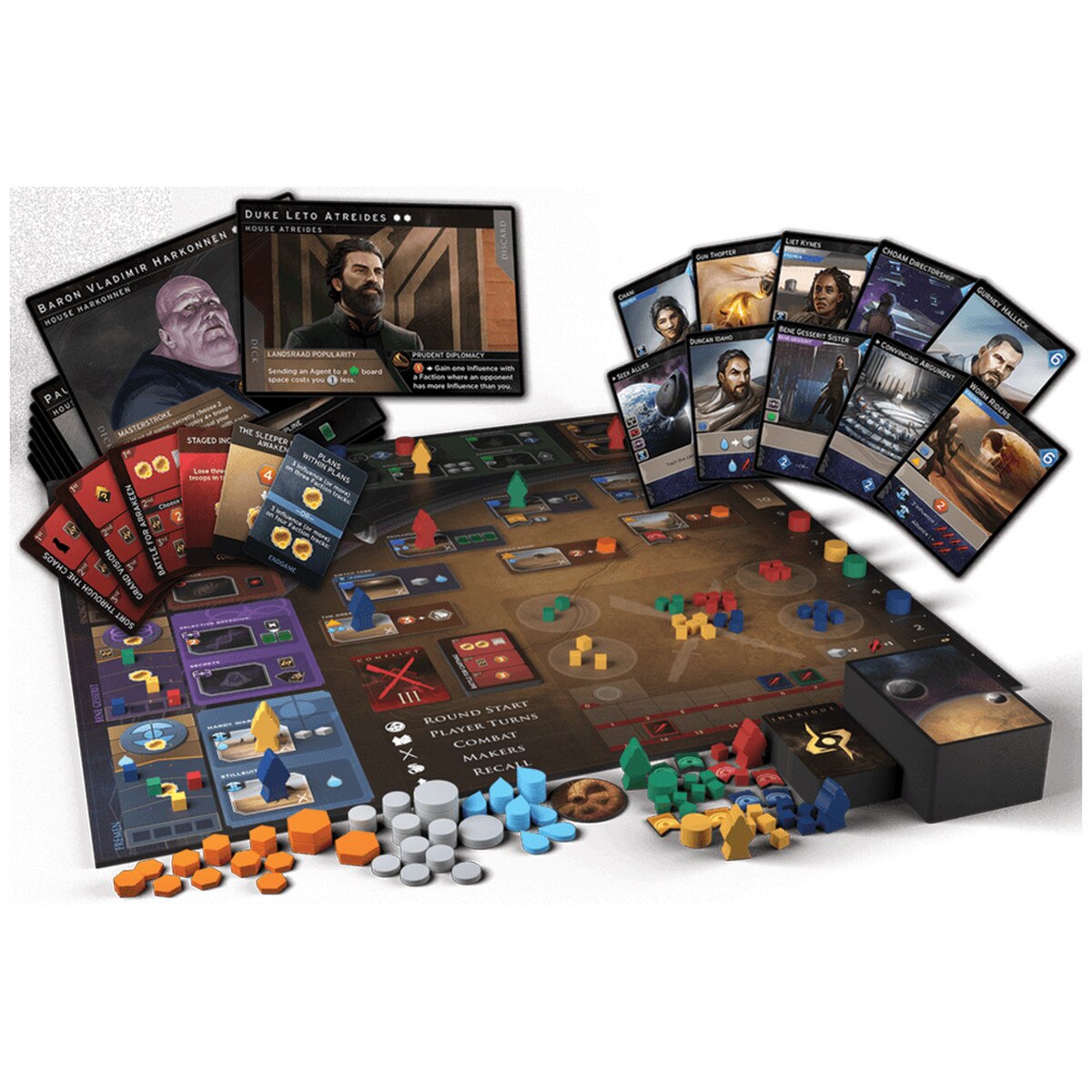 Dune: Imperium is a game that finds inspiration in elements and characters from the Dune legacy, both the new film from Legendary Pictures and the seminal literary series from Frank Herbert, Brian Herbert, and Kevin J. Anderson. As a leader of one of the Great Houses of the Landsraad, raise your banner and marshal your forces and spies. War is coming, and at the center of the conflict is Arrakis – Dune, the desert planet. Dune: Imperium uses deck-building to add a hidden-information angle to traditional worker placement. You start with a unique leader card, as well as deck identical to those of your opponents. As you acquire cards and build your deck, your choices will define your strengths and weaknesses. Cards allow you to send your Agents to certain spaces on the game board, so how your deck evolves affects your strategy. You might become more powerful militarily, able to deploy more troops than your opponents. Or you might acquire cards that give you an edge with the four political factions represented in the game: the Emperor, the Spacing Guild, the Bene Gesserit, and the Fremen. Unlike many deck-building games, you don’t play your entire hand in one turn. Instead, you draw a hand of cards at the start of every round and alternate with other players, taking one Agent turn at a time (playing one card to send one of your Agents to the game board). When it’s your turn and you have no more Agents to place, you’ll take a Reveal turn, revealing the rest of your cards, which will provide Persuasion and Swords. Persuasion is used to acquire more cards, and Swords help your troops fight for the current round’s rewards as shown on the revealed Conflict card. Defeat your rivals in combat, shrewdly navigate the political factions, and acquire precious The Spice Must Flow cards to lead your House to victory!