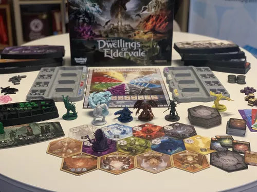 Dwellings of Eldervale is an epic worker placement game set in a once lost magical world. Giant elemental monsters roam while dragons, wizards and warriors battle for dominance over 8 elemental powers. Players control unique factions seeking to adventure, battle, grow in power and ultimately dwell Eldervale, shaping it to their vision.
