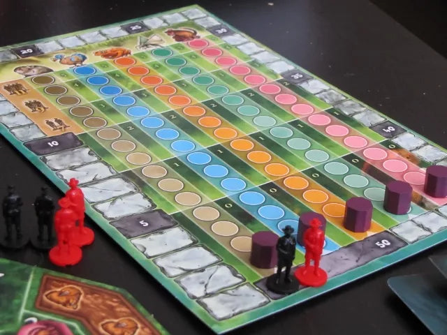 Finally, the card in the D slot increases the value of one animal. You (and only you!) immediately score one point per animal of the type you moved up on the scale. If you don't have an animal of that type you don't get any points. Each animal has a points threshold so that if you move an animal up, say, four times, each animal of this type is worth an extra point at the end of the game. The scale goes up to five so that every animal can be worth up five points at the end of the game. When the sum of these values for all five animals equals seven, nine or eleven (based on the number of players), the game ends at the conclusion of the round. Players then tally their final scores to see who wins.